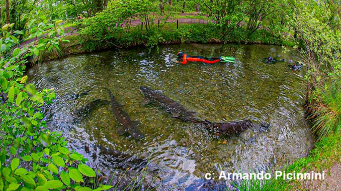 Der Parco Ittico bei Mailand ist ein Schaugewässer, um seinen Gästen möglichst viele europäische Süßwasserfische vom Ufer aus näher zu bringen. Mein Biologenfreund Dr. Armando Picinnini berät den Besitzer fischtechnisch in biologischen Fragen. Im Gegenzug erhält er dadurch die exklusive Möglichkeit dort zu schnorcheln und er hat auch die Sondererlaubnis für uns ausgehandelt, dort zu Schnorcheln.